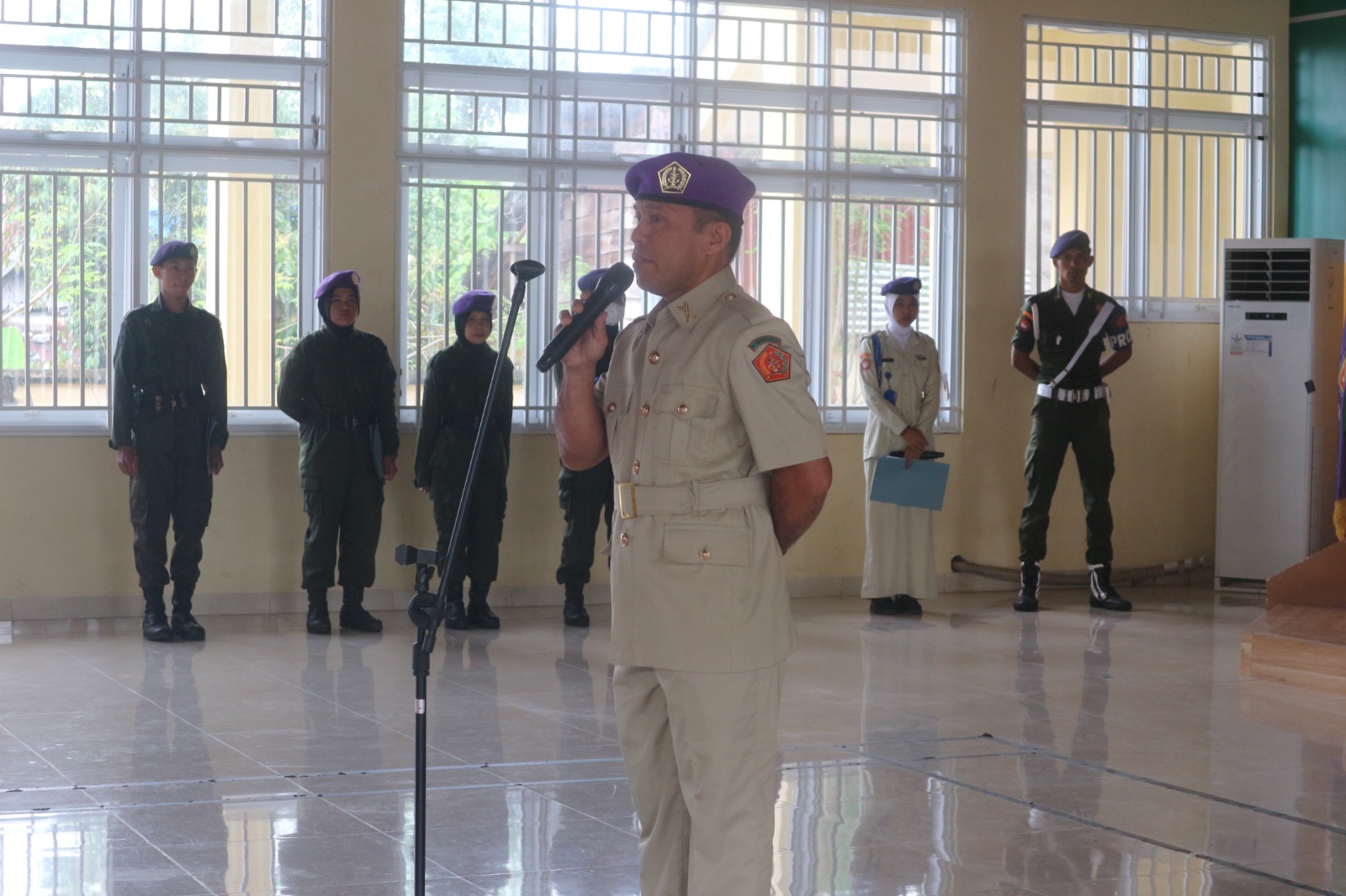 Dalam upacara dilanjutkan dengan pemasangan penyematan tanda peserta dan pelatih dengan tujuan bahwa peserta Pra-diksar dan pelatih telah siap melaksanakan program pelatihan selama sebulan ke depan. (Humas)