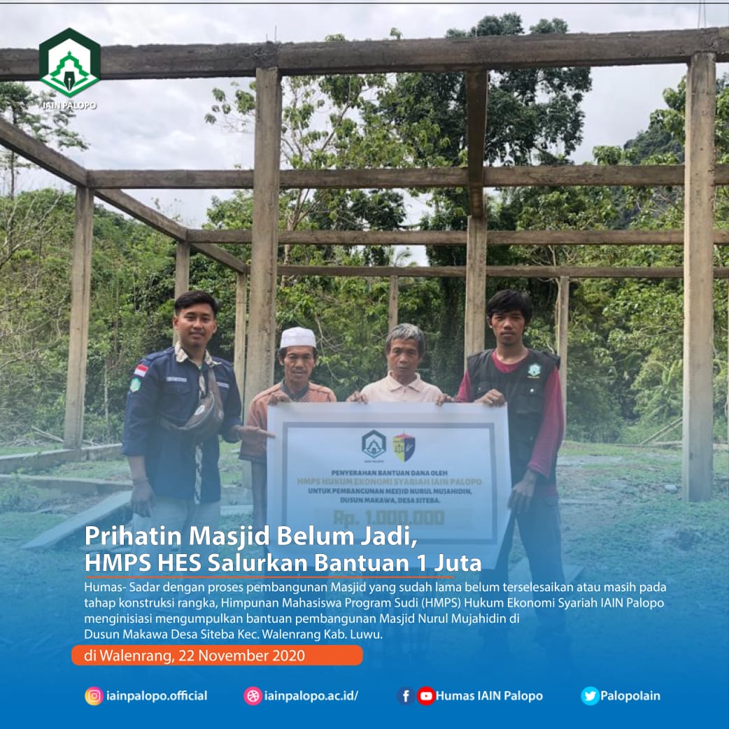 Humas- Sadar dengan proses pembangunan Masjid yang sudah lama belum terselesaikan atau masih pada tahap konstruksi rangka, Himpunan Mahasiswa Program Sudi (HMPS) Hukum Ekonomi Syariah IAIN Palopo menginisiasi mengumpulkan bantuan pembangunan Masjid Nurul Mujahidin di Dusun Makawa Desa Siteba Kec. Walenrang Utara.